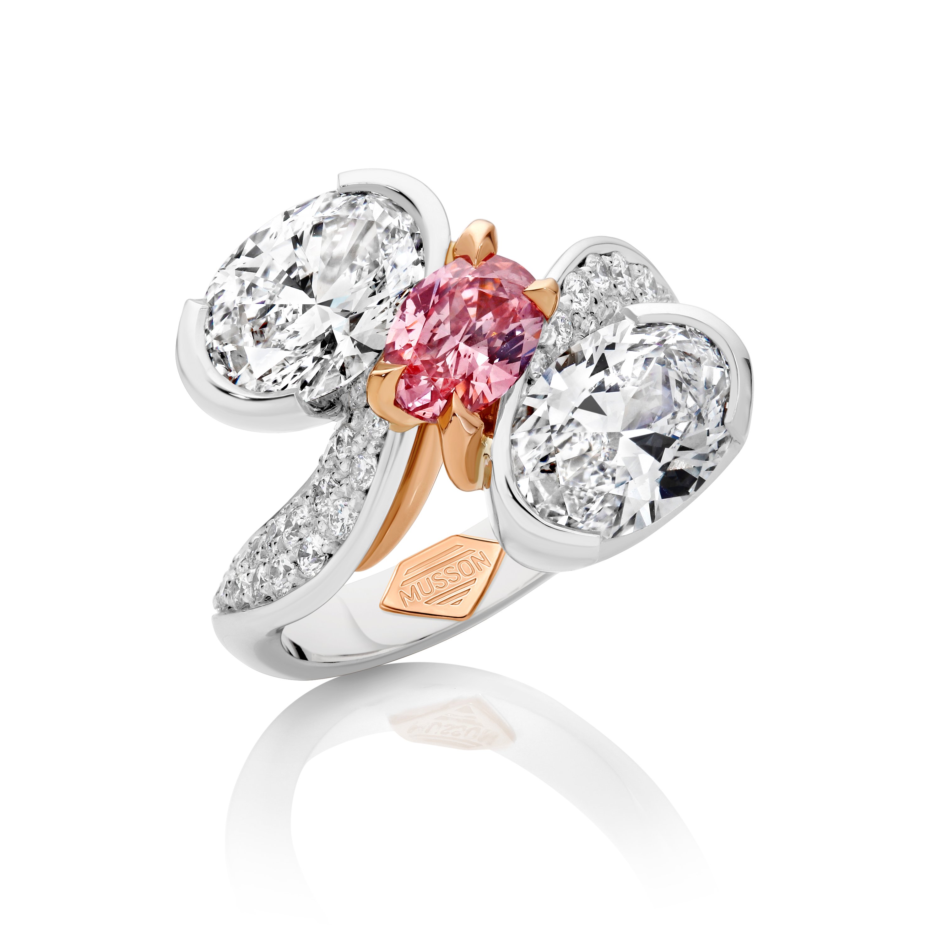 Selene features a 0.82ct Oval Argyle Pink Diamond from the 2021 Argyle Tender framed by a matched pair of 2ct Argyle White Diamonds.
